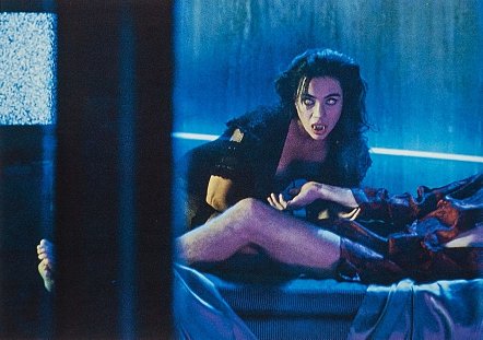 Led by the sultry Regine (Julie Carmen; In the Mouth of Madness), Bozworth (Brian Thompson; The Terminator, Alien Nation, Nightwish), Louie (Jon Gries; TerrorVision, The Monster Squad) and Belle (Russell Clark; choreographer from Vamp) round out her vampiric team seeking revenge against Charley Brewster for killing her brother, Jerry Dandridge (Chris Sarandon in Fright Night).