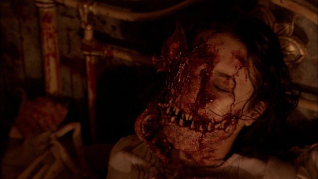 At first, it’s like one of the Morlock troglodytes from The Descent (2005) relocated to the subways. But deeper into the film, it feels a lot more like a Wrong Turn (2003) inbred hillbilly took to the sewers instead. The Creep has a lair, keeps captives in his sewer prison, harvests chunks of meat from victims to feed his swarm of rats as if it was a house chore, and plays doctor mutilating victims.