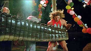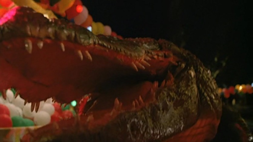 Although any individual actor may be fairly holding their own under the circumstances, the pacing is sluggish and the dialogue is painful. Oh, and the alligator shots are weak—mostly full body shots in the dark at great distance of a guy in a rubber gator suit or an actual alligator, or close up shots of an animatronic tail, flank, or head. Eventually we start actually seeing more of the alligator, but it’s never satisfying. And when it starts attacking people, the attacks are slow and sort of boring. Imagine if you will a pool float slowing moving towards a victim, and once the pool float slowly touches the victim, they scream and flail in the water as if being mauled and ravaged. Yeah, it’s often like that. Even the finale when the alligator ravages a carnival… yeah, even that sucked. The violence sucks, the gore is almost entirely absent, and the alligator attacks are neutered.
