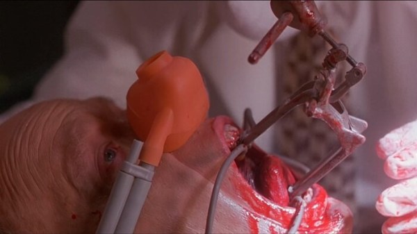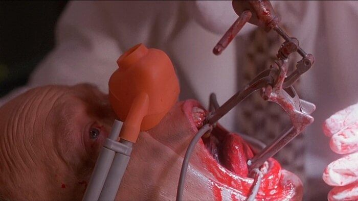 Unfortunately, this was not nearly as gory as I had remembered. Sure, there are some entertaining visuals. But they are shorter-lived and less extreme than my 90s teen memory served (and, to be clear, it is a rarity that this happens to me). The tooth extractions aren’t nearly as mean or grueling or graphic, the slashing stabs are less obviously apparent and barely on screen, and the “jaw widener” scene was not as jaw-dropping. Although, that device probably offered the best gag of the movie, and they got a lot of mileage out of it.